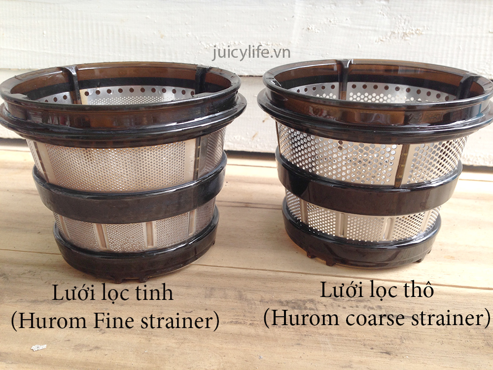 Các dòng máy ép chậm Hurom thường đi kèm hai loại lưới lọc: Fine strainer (lưới lọc tinh, các lỗ rất nhỏ) và Coarse strainer (lưới lọc thô, lỗ to hơn).