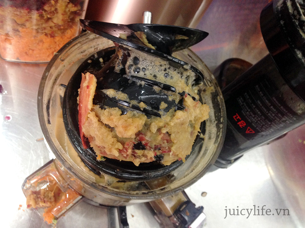 – Nước ép lẫn trong bã nhiều cũng là hiện tượng của máy tắc. Nếu do cho nhiều và nhanh nguyên liệu quá, cần dừng lại kiểm tra cho máy nghiến hết chỗ nglieu bên trong đã.
