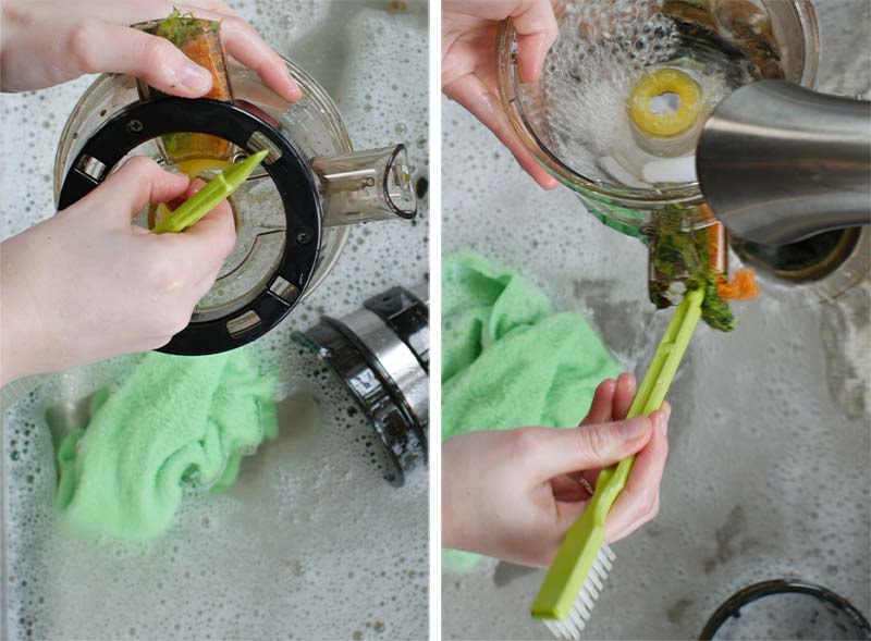 – Rửa dưới vòi nước. Dùng cọ chổi đi kèm. Chú ý các góc khuất như juice cap (phần trên của đầu ra juice), vòng khía tròn ở đáy bowl máy.