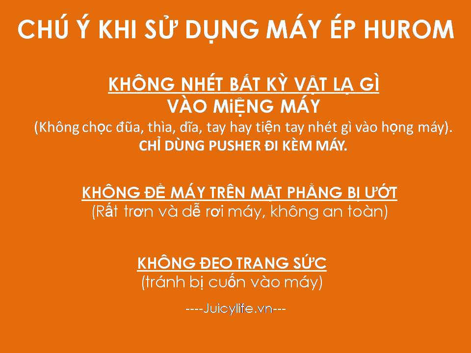 + Hurom được thiết kế để ép liên tục không quá 30 phút nên nếu ép nhiều hoặc ép các nguyên liệu cứng như bí đỏ hoặc khoai lang thì máy rất dễ nóng. Bạn nên chú ý cho máy nghỉ giữa chừng.