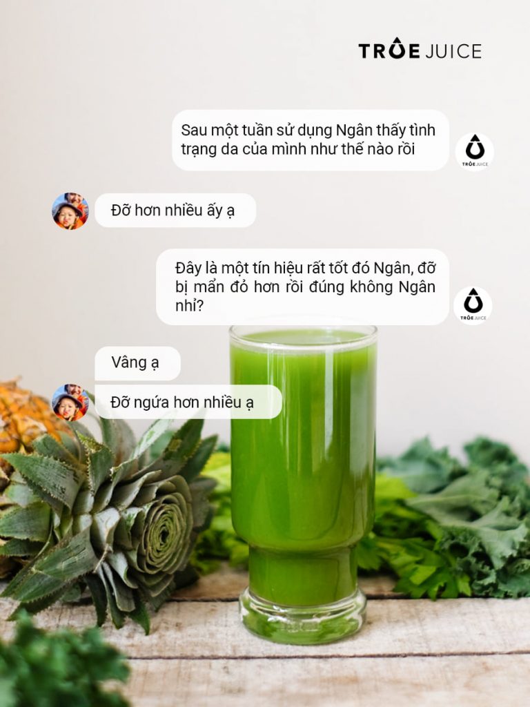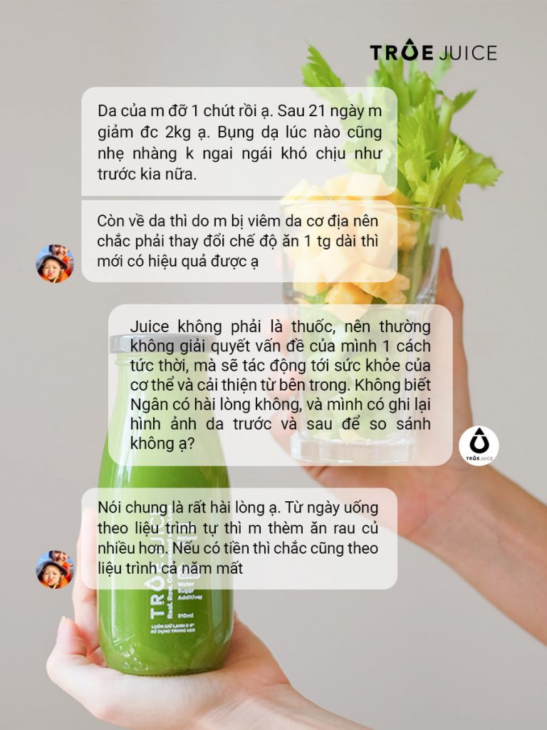 “Viêm da ai cũng nói khỏi lâu lắm ạ. Nhưng mà ăn eat clean kết hợp với juice nhà mình em thấy nhẹ người hơn hẳn. Cảm thấy dễ chịu ấy”.