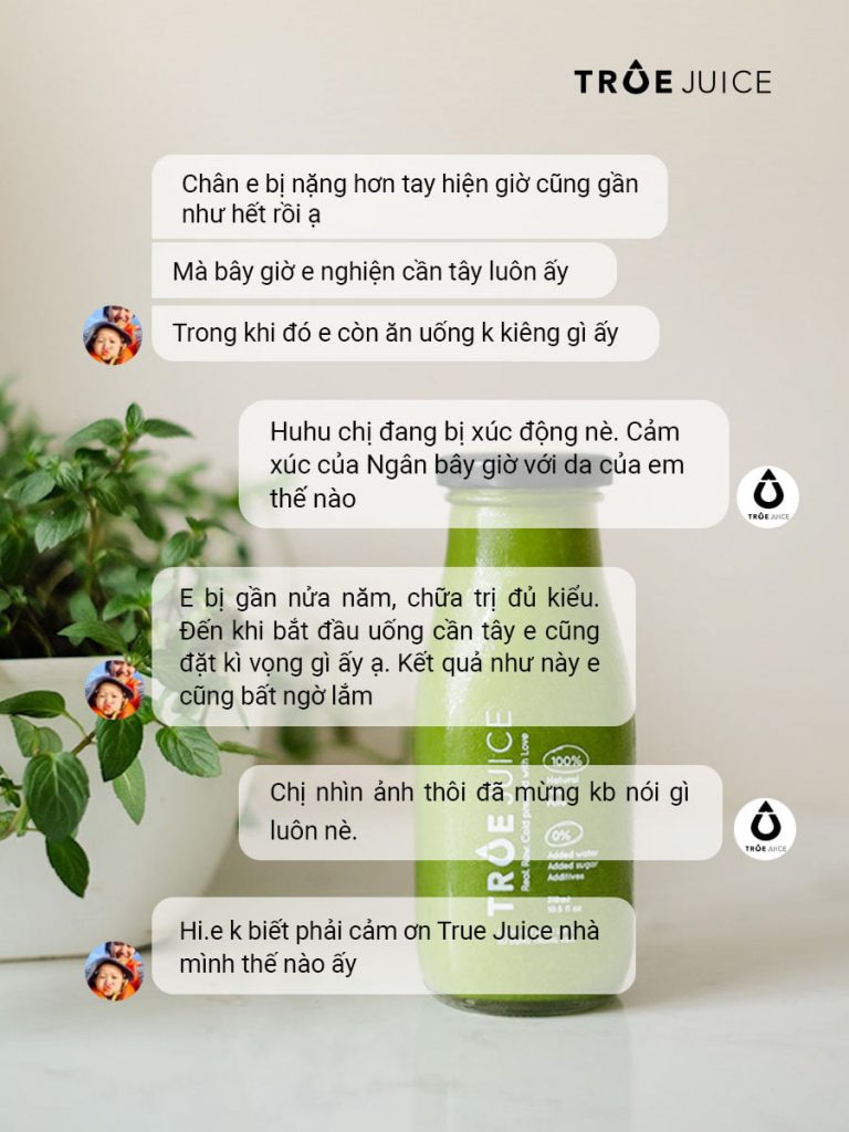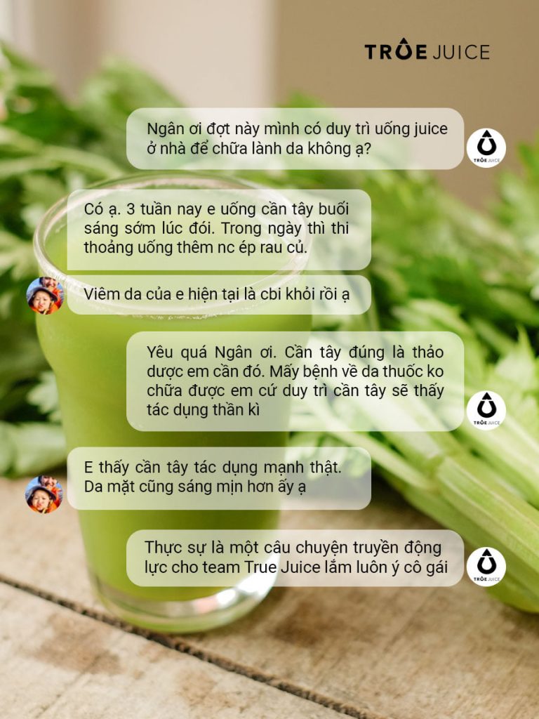 “Em bị viêm da gần nửa năm, chữa trị đủ kiểu. Đến khi bắt đầu uống cần tây em cũng không đặt kỳ vọng gì ấy ạ. Kết quả như này em cũng bất ngờ lắm. Không biết phải cảm ơn True Juice nhà mình thế nào ấy”.