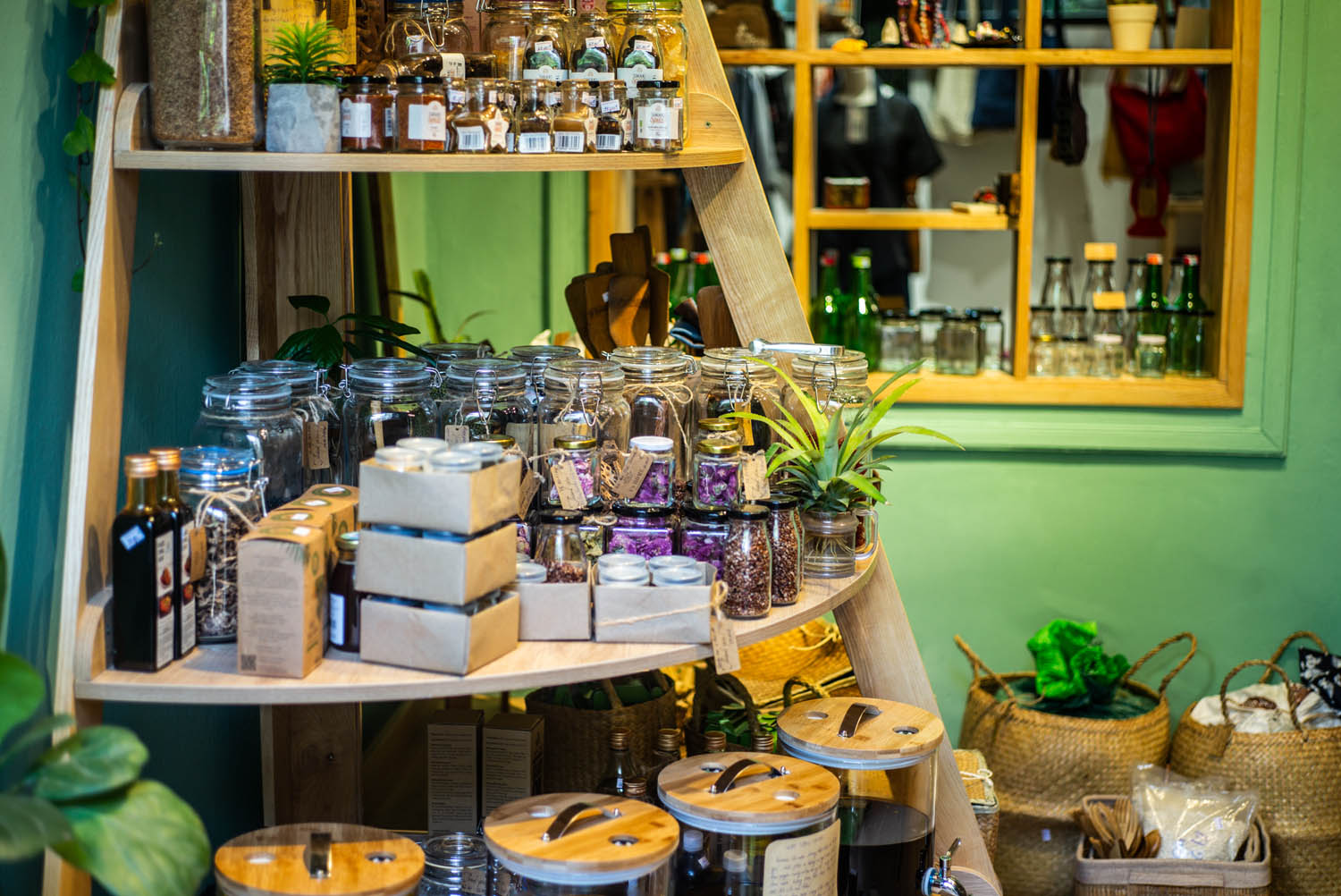 Tại V’s Home, bạn sẽ không tìm thấy ống hút nhựa, túi nilong. Bữa trưa sạch lành đựng trong hộp thủy tinh, túi giấy đựng đồ thân thiện. Tiệm còn có một sạp rau khiêm nhường nhỏ xinh, với mong ước giản dị kết nối mô hình nông nghiệp không hóa chất độc hại với người tiêu dùng và hỗ trợ nông dân các vùng miền, cũng là một điểm nhấn khác của V’s Home.